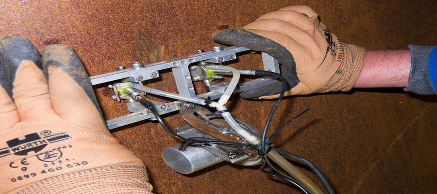 At a construction site, a technician tests a pipeline weld for defects using an ultrasonic phased array instrument. The scanner, which consists of a frame with magnetic wheels, holds the probe in contact with the pipe by a spring. The wet area is the ultrasonic couplant that allows the sound to pass into the pipe wall.